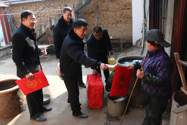 扶贫小组成员分别深入9户贫困村民家中,询问、察看困难群众过节准备情况,并把一袋大米、一桶食用油、一床新棉被、200元现金交到每户贫困村民手中,诚挚祝福他们春节愉快、开心过年。