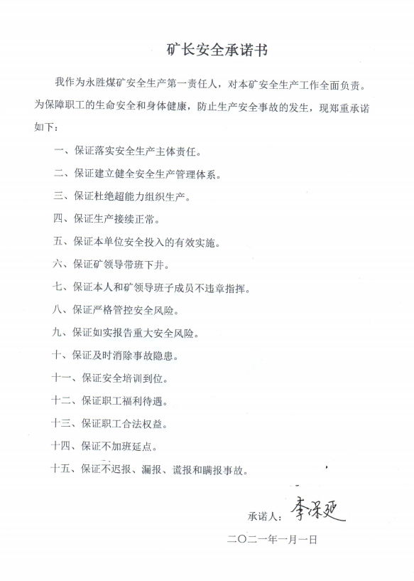 永胜煤矿矿长安全承诺书