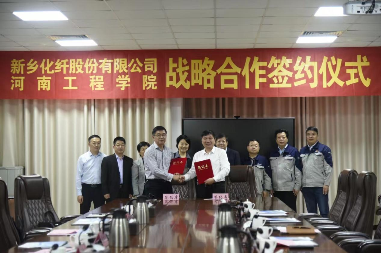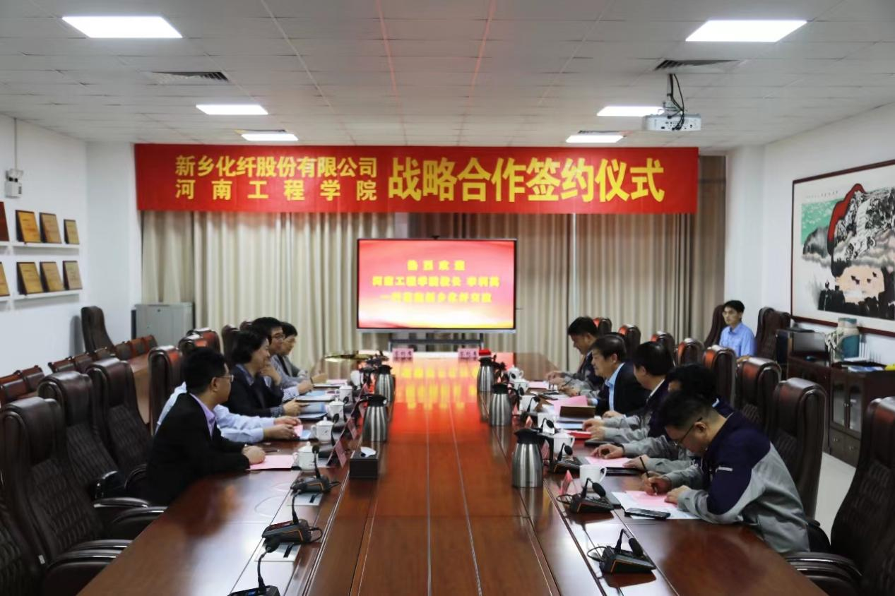 10月25日下午,河南工程学院校长李利英,副校长张瑞林带领校长办公室、科研处、材料与工程学院负责人一行到新乡化纤股份有限公司洽谈共建生态纺织新材料科技创新联合体相关事宜,并与新乡化纤股份有限公司签订战略合作协议。