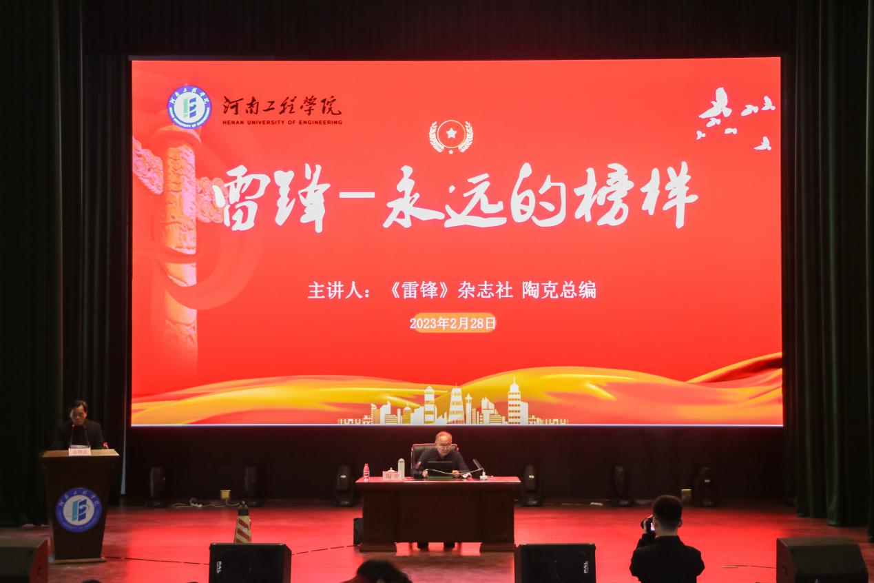 袁静波主持会议时指出,陶克将军的报告,是一场视野宏阔、内涵丰富的高质量思想政治报告。陶克将军以“雷锋-永远的榜样”为主题,用丰富的图片、平实的语言和深切的情感将雷锋同志在苦难童年和军旅生涯中的思想进步、业务提高、模范事迹等多个侧面勾画得轮廓清晰、栩栩如生,为同学们了解榜样、学习模范明确了目标、指明了方向。接下来,学校会加强青年学生教育、以雷锋同志为榜样,提升志愿服务质量,持续深化与《雷锋》杂志社在红色基因传承、校园文化宣传等方面的交流合作,真正把雷锋精神融入到河南工程学院的发展中来,为学校推进实施“十四五”规划、加快硕士授权单位建设、提升应用型本科办学水平贡献力量。