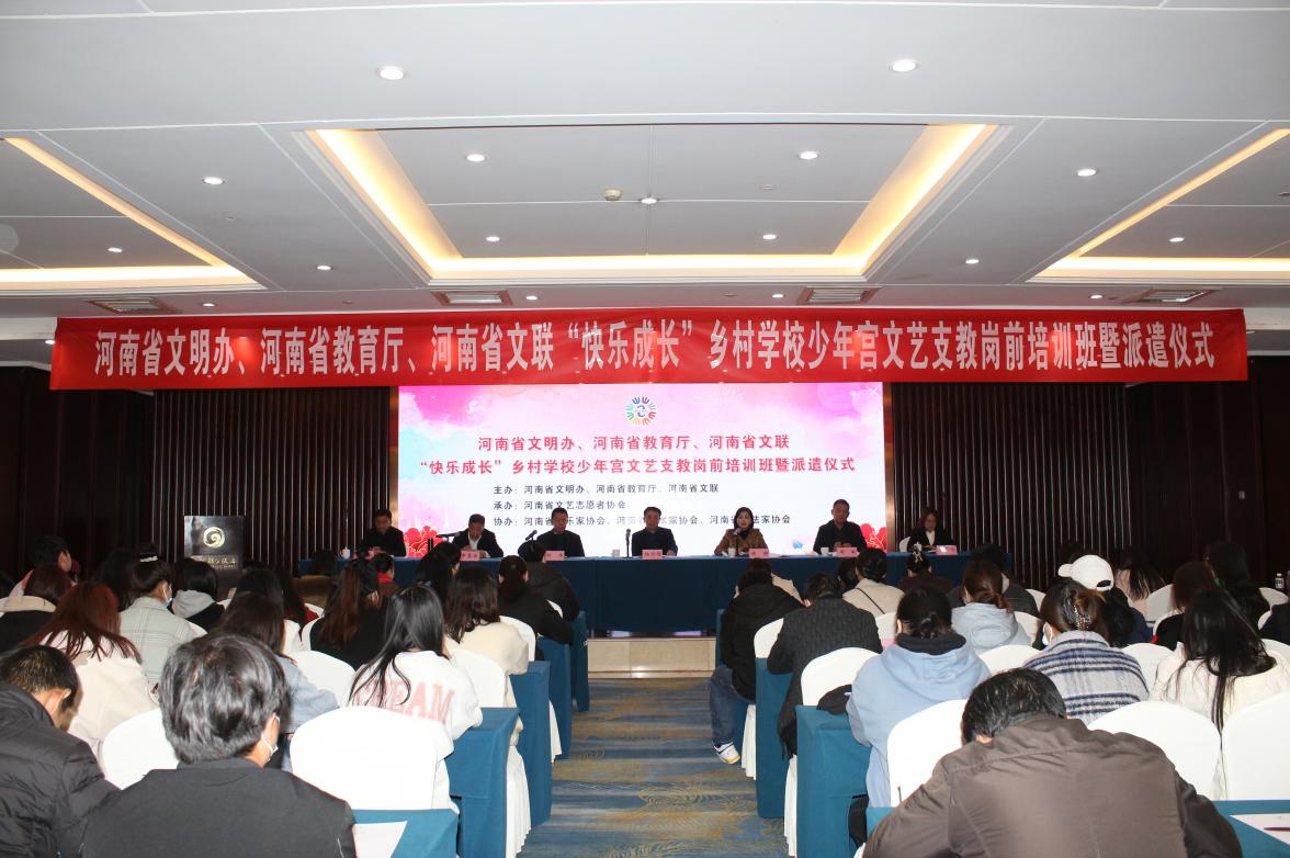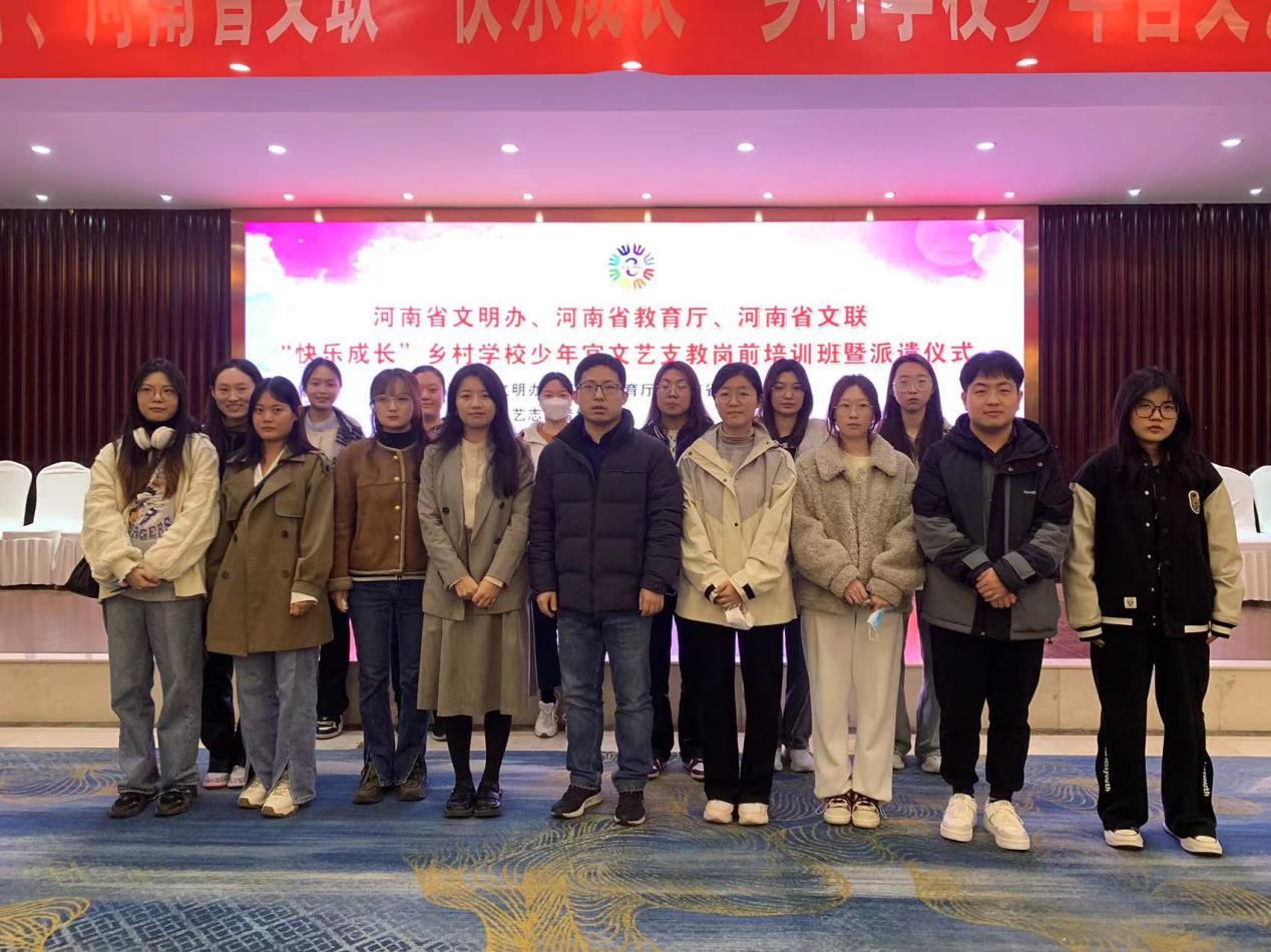 3月24日上午,由河南省文明办、河南省教育厅、河南省文联主办的“‘快乐成长’乡村学校少年宫文艺支教志愿者岗前培训班暨派遣仪式”在郑州市大河锦江饭店四楼太行厅举行。校团委副书记张浩、艺术设计学院辅导员范梦茜老师带领学校参与此次文艺支教的14名志愿者参加了培训班。
