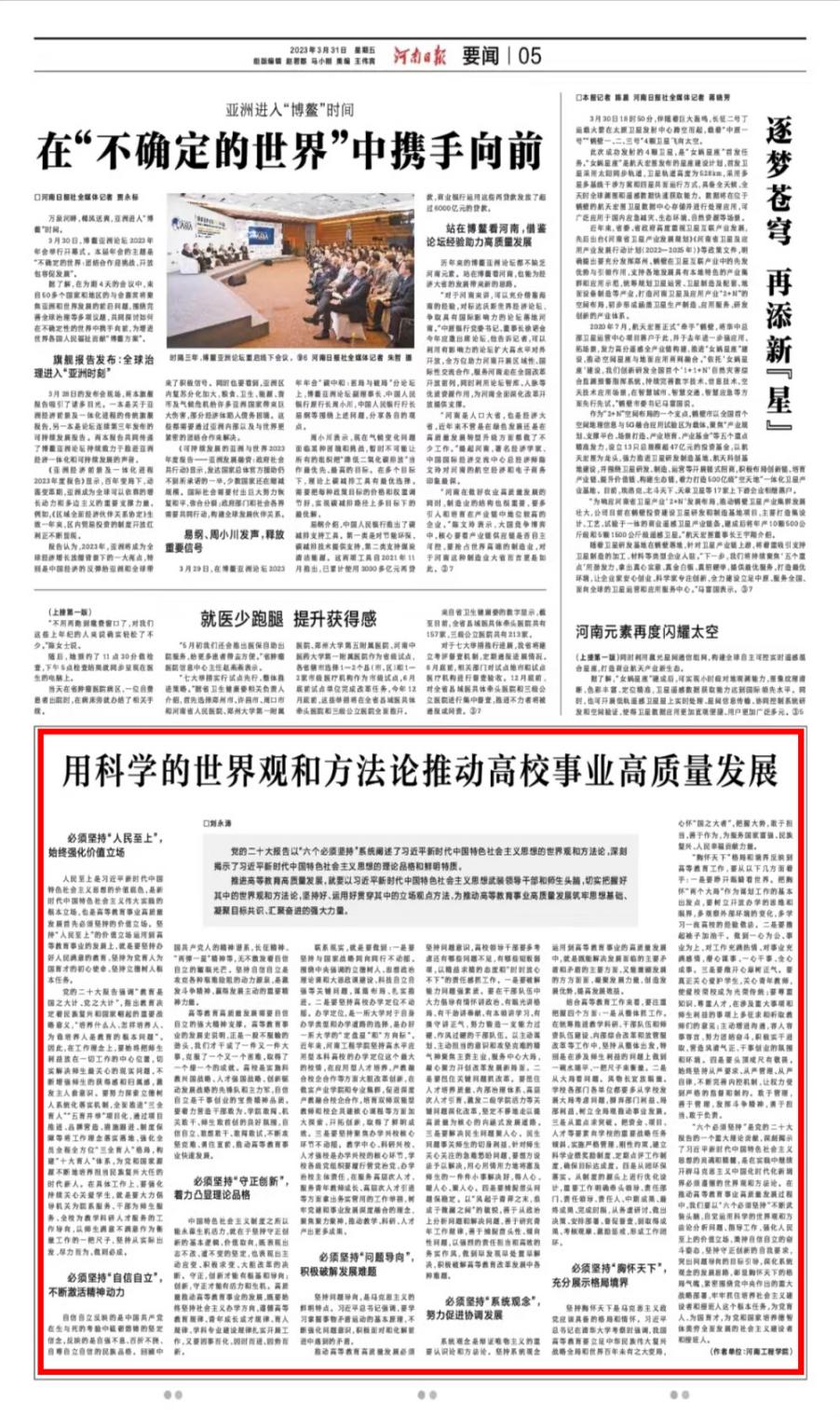 3月31日,《河南日报》第05版以《用科学的世界观和方法论推动高校事业高质量发展》为题,刊发我校党委书记刘永涛的理论文章。文章坚持理论和实际相结合,就如何深入学习贯彻党的二十大精神,推动高校事业高质量发展进行了系统阐述。