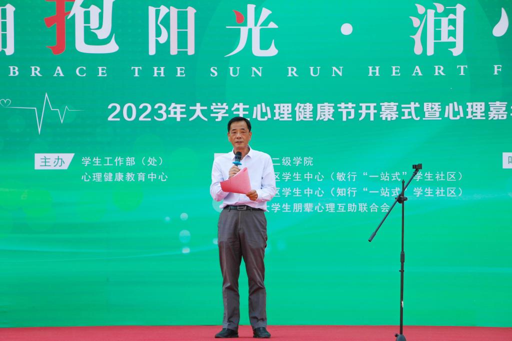 袁静波在致辞中对学校心理咨询师团队和全体心理工作者们的付出表示感谢。他指出,学校党委高度重视大学生心理健康教育工作,始终着眼学生的健康发展。相关职能部门要协同作战,科学谋划、密切配合,形成齐抓共管的工作局面,全面提升我校大学生心理健康工作。对提升同学们的心理健康水平和办好此次活动提出了三点殷切希望:一是提高认识,理清心理健康重要意义;二是要坚定信念,发掘个体生命内涵;三是仁爱通达,希望同学们“将心比心”,真正做到把关怀相互传递,让温暖围绕在我们身边。