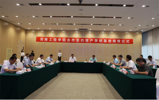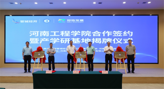 仪式上,焦有宙代表学校与管城经济技术开发区管理委员会、河南郑地产城融合建设发展有限公司共同签署产学研合作协议,并现场为河南工程学院校外实习基地、产学研合作基地、就业基地揭牌。