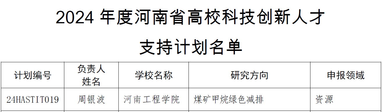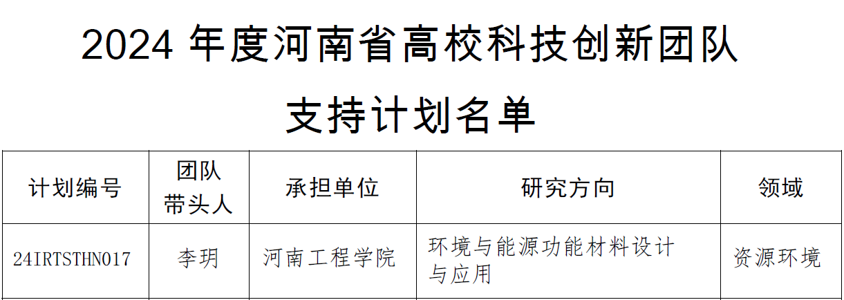 近日,河南省教育厅下发《河南省教育厅关于公布2024年度河南省高校科技创新团队和创新人才支持计划名单的通知》(教科技[2023]325号)文件,我校化工与印染工程学院李玥副教授作为带头人申报的“环境与能源功能材料设计与应用”团队入选2024年度河南省高校科技创新团队支持计划;资源与安全工程学院的周银波副教授申报的“煤矿甲烷绿色减排”入选2024年度河南省高校科技创新人才支持计划。