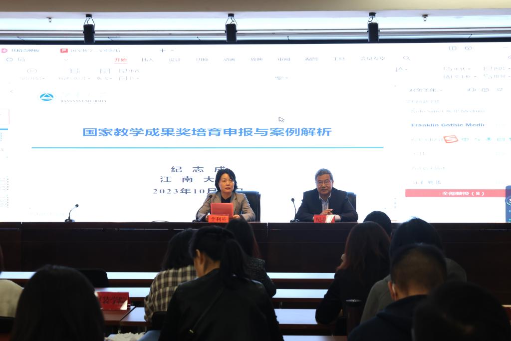 纪志成围绕教学成果奖的核心要素、教学成果奖的培育举措、申报关键点及注意事项、成功获奖案例深度解析等四个方面,从细节入手,全面介绍了教学成果奖申报要素及注意事项。他指出,优秀的教学成果应具备完整的教育教学方案、正确的教育教学规律、显著的教学实践效果及原创的教育教学思想。他以江南大学为例,介绍了江南大学教学成果奖的培育举措,并针对我校省级、国家级教学成果培育及申报工作奖献计献策。参会教师就教学成果奖培育过程中存在的问题和疑惑与纪志成教授进行了深入交流。