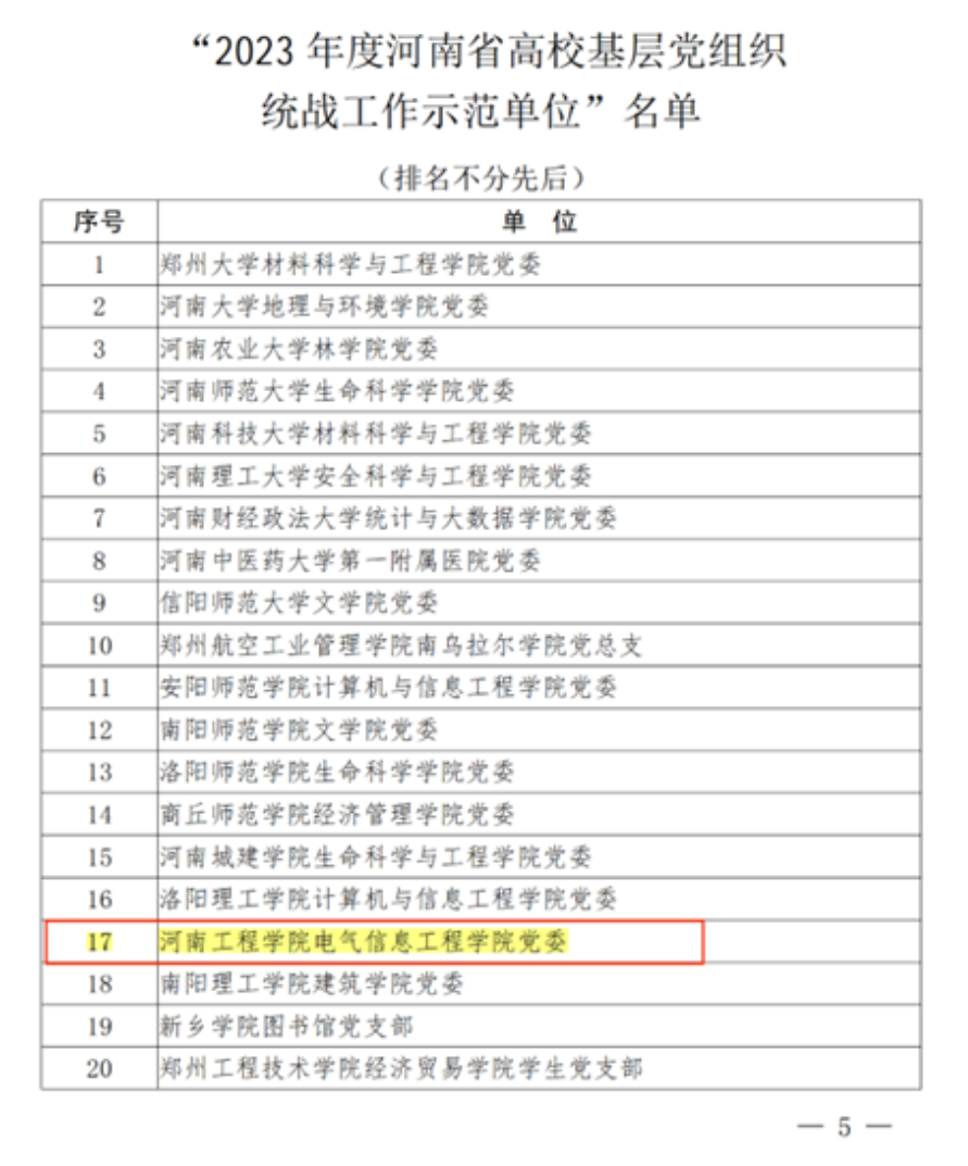 近日,中共河南省委教育工委、河南省教育厅下发《关于公布2023年度高校统战工作有关评选活动结果的通知》(豫教工委〔2024〕25号),我校电气信息工程学院党委被授予“2023年度河南省高校基层党组织统战工作示范单位”称号。