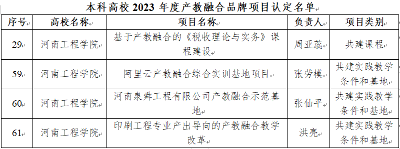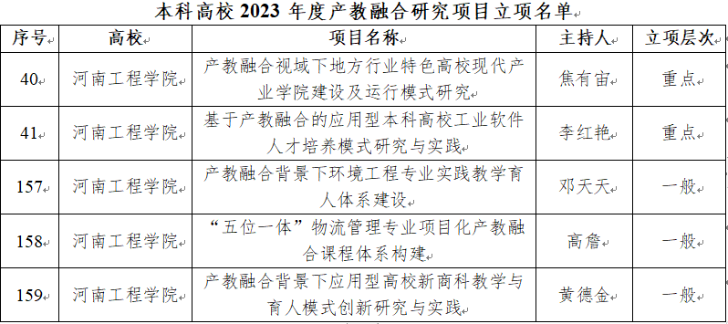近日,河南省教育厅办公室下发了《关于公布河南省本科高校2023年度产教融合系列项目名单的通知》(教办高〔2024〕13号),我校“产教融合视域下地方行业特色高校现代产业学院建设及运行模式研究”等2个项目立项为河南省本科高校2023年产教融合重点研究项目,“产教融合背景下环境工程专业实践教学育人体系建设”等3个项目立项为河南省本科高校2023年产教融合一般研究项目,“基于产教融合的《税收理论与实务》课程建设”等4个项目认定为河南省本科高校2023年产教融合品牌项目,电气信息工程学院、服装学院认定为河南省本科高校2023年产教融合示范学院。