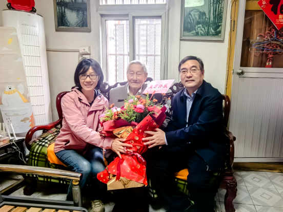 “马老,祝您生日快乐。”当天正逢马国良99岁寿辰,刘超一行送上鲜花、慰问品,带去学校的祝福和关心关怀。刘超详细了解了马老先生的身体状况、生活状况,叮嘱他照顾好身体,安享晚年生活,感谢他为学校发展所做的贡献,并向马老介绍了学校近期的发展状况,祝愿他健康长寿、阖家幸福。