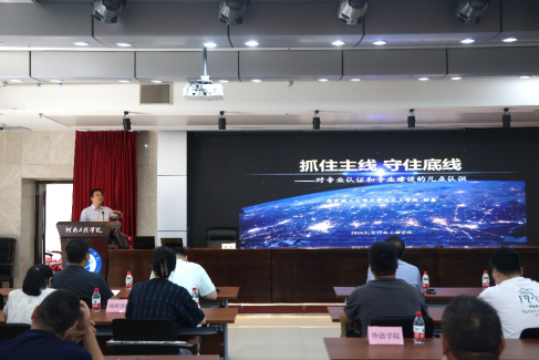 为促使我校工程教育认证工作提质增效,进一步推进我校审核评估工作高效开展,5月22日上午,特邀请南京理工大学国家级教学名师钟秦教授在综合楼一楼为我校做题为“抓住主线 守住底线—对工程教育专业认证的几点认识”的专题报告。副校长焦有宙出席此次报告会,二级学院教学院长、专业负责人、公共课课程负责人、专业认证核心成员及教务处人员听取了报告,报告会由教务处处长李红艳主持。
