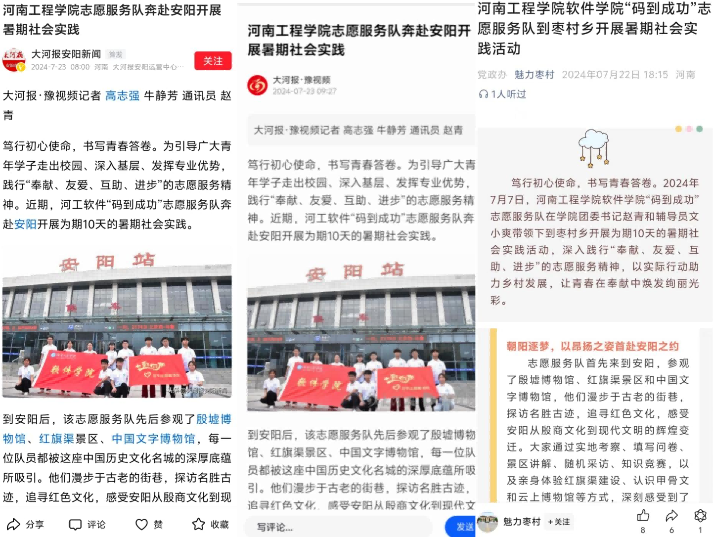 笃行初心使命,书写青春答卷。为助力乡村全面振兴,推进软件学院“悦河南·阅出彩”人文素养工程的全面落实,引导广大青年学子走出校园、深入基层、发挥专业优势,践行“奉献、友爱、互助、进步”的志愿服务精神。7月7日,软件学院“码到成功”志愿服务队在软件学院团委书记赵青、辅导员文小爽带领下奔赴安阳开展暑期社会实践。