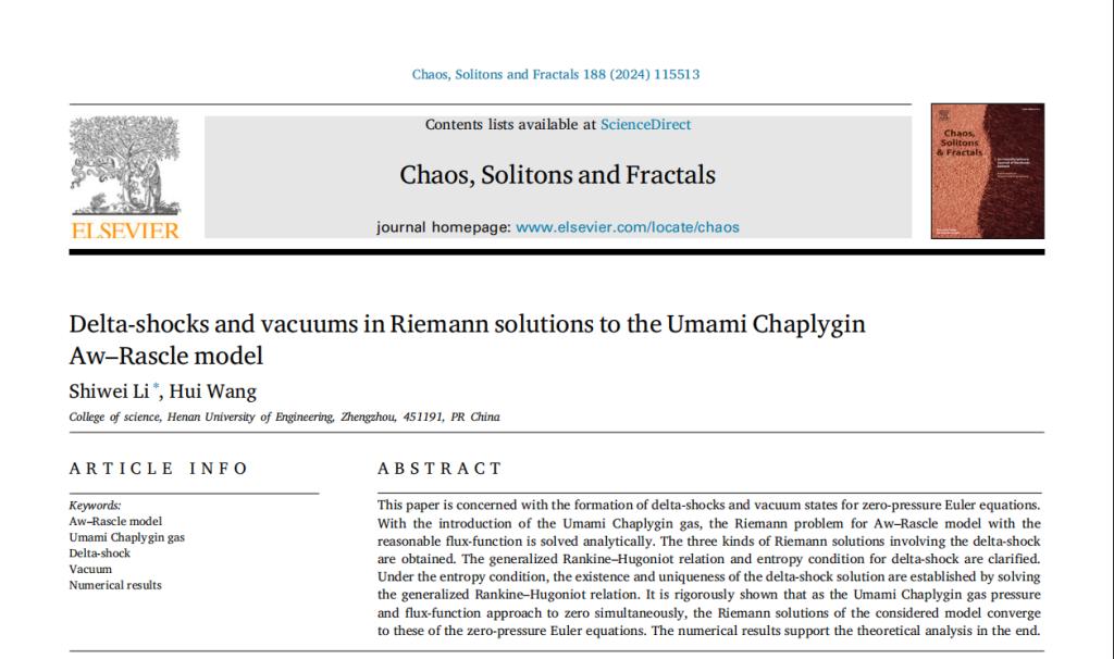 近日,我校理学院研究团队在非线性科学领域国际著名学术期刊 《Chaos, Solitons & Fractals》上发表题为“Delta-shocks and vacuums in Riemann solutions to the Umami Chaplygin Aw-Rascle model (鲜味Chaplygin气体的Aw-Rascle交通流模型中黎曼解的狄拉克激波与真空)”的研究论文。李士伟博士为论文第一作者和通讯作者,王辉副教授为论文第二作者,河南工程学院为唯一完成单位。