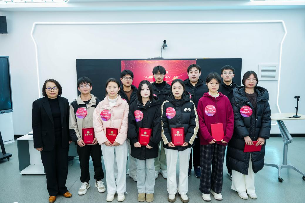 外语学院副院长王辉宣读了大赛获奖学生名单。获得大赛特等奖、一等奖和二等奖的10位同学同时被授予2024河南工程学院“十大校园英语词达人”荣誉称号。与会领导为获奖同学颁发荣誉证书并合影留念。