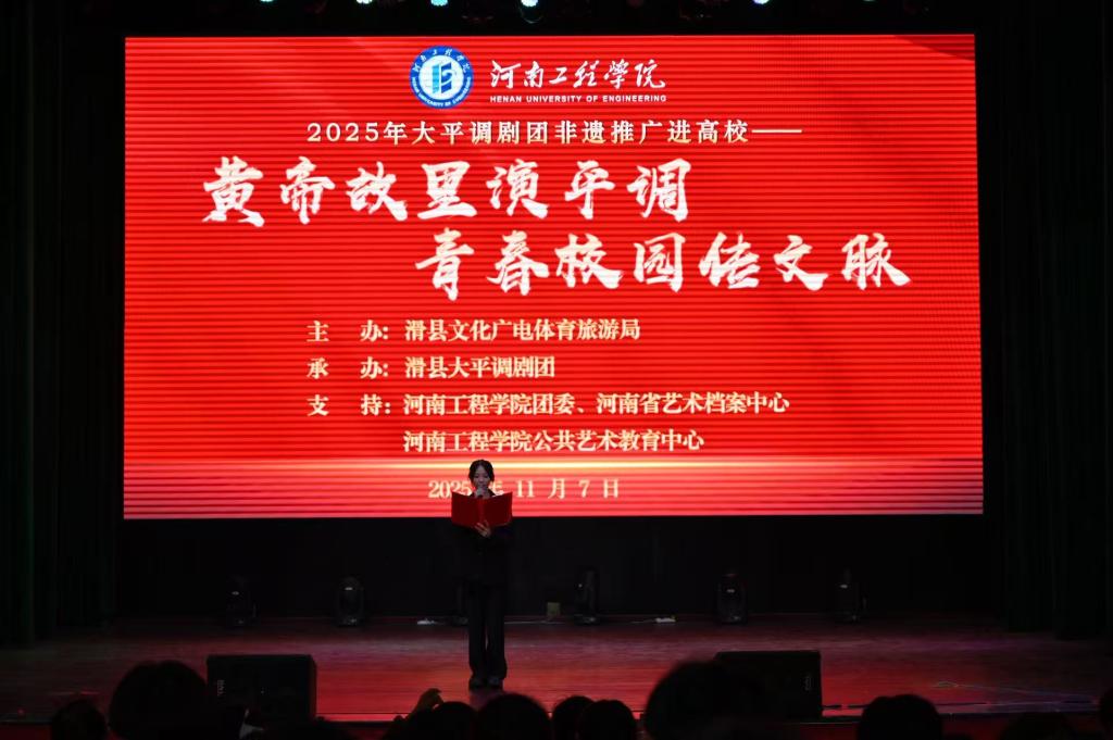 11月7日下午,“2025年大平调剧团非遗交流推广活动”在我校西区大礼堂隆重举行。本次活动以“黄帝故里演平调,青春校园传文脉”为主题,通过经典剧目展演、非遗文化互动等形式,将承载着深厚历史底蕴的大平调艺术带入青春校园,开启了一场传统与现代、非遗与青春的双向奔赴。河南省艺术档案中心主任裴小松、滑县文化广电体育旅游局党组成员、副局长张秀飞,滑县大平调剧团团长黄高飞、剧团支部书记邢宝军、河南机电职业学院宣传统战部部长刘语出席活动,滑县大平调表演艺术家,我校团委、公共艺术中心负责人,学校师生代表参加活动。