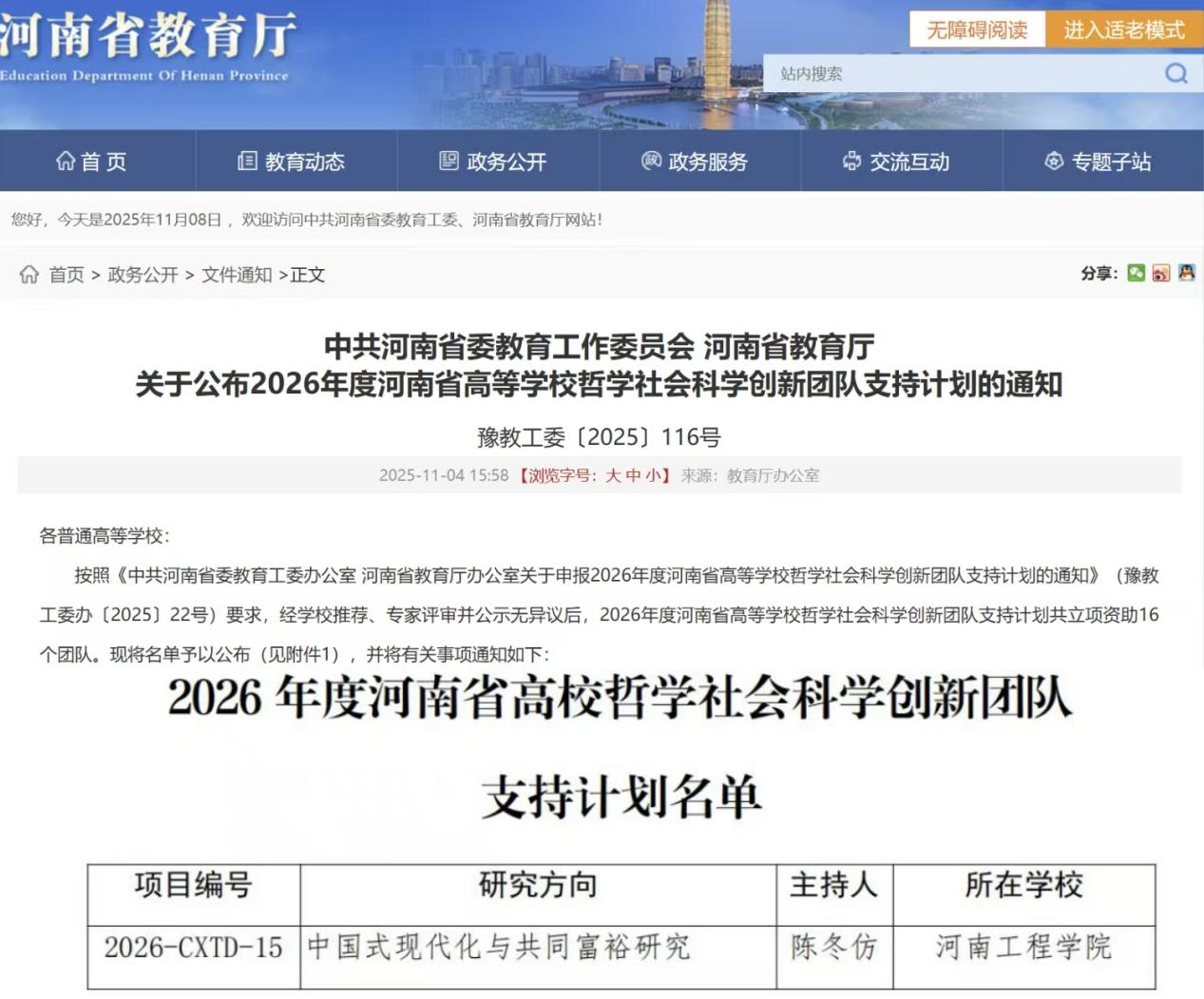 近日,我校陈冬仿教授申报的“中国式现代化与共同富裕研究”项目入选2026年度河南省高等学校哲学社会科学创新团队支持计划,是我校首次获批河南省高校哲学社会科学创新团队。