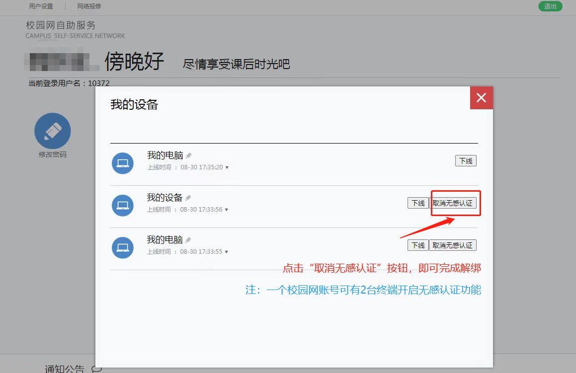 若该设备无需再使用无感认证功能,可登录校园网自助服务网址进行解绑,如下图所示: