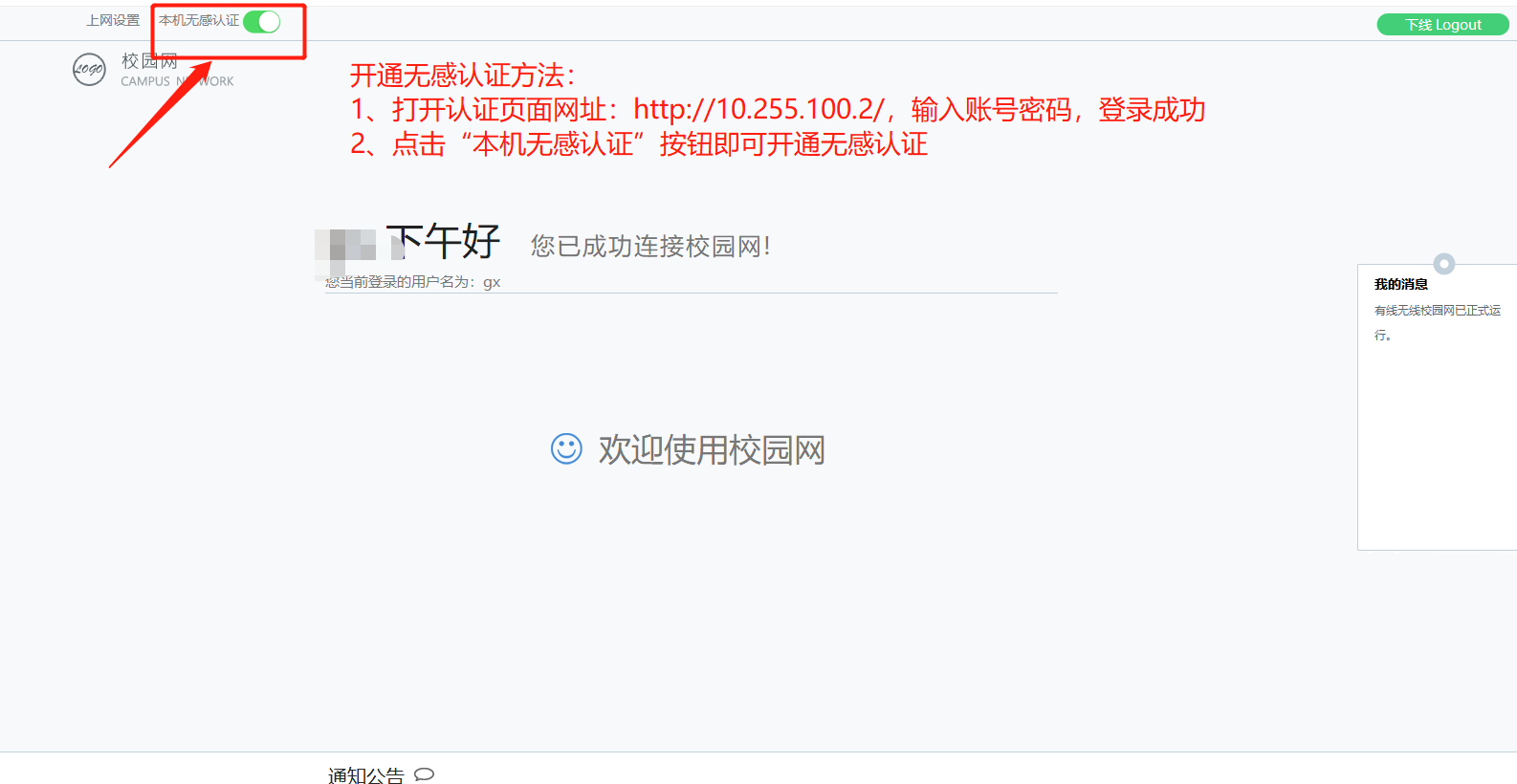 1.建议收藏认证页面网址(http://10.255.100.2/),以免无法自动跳转登录认证页面,方便上网认证。