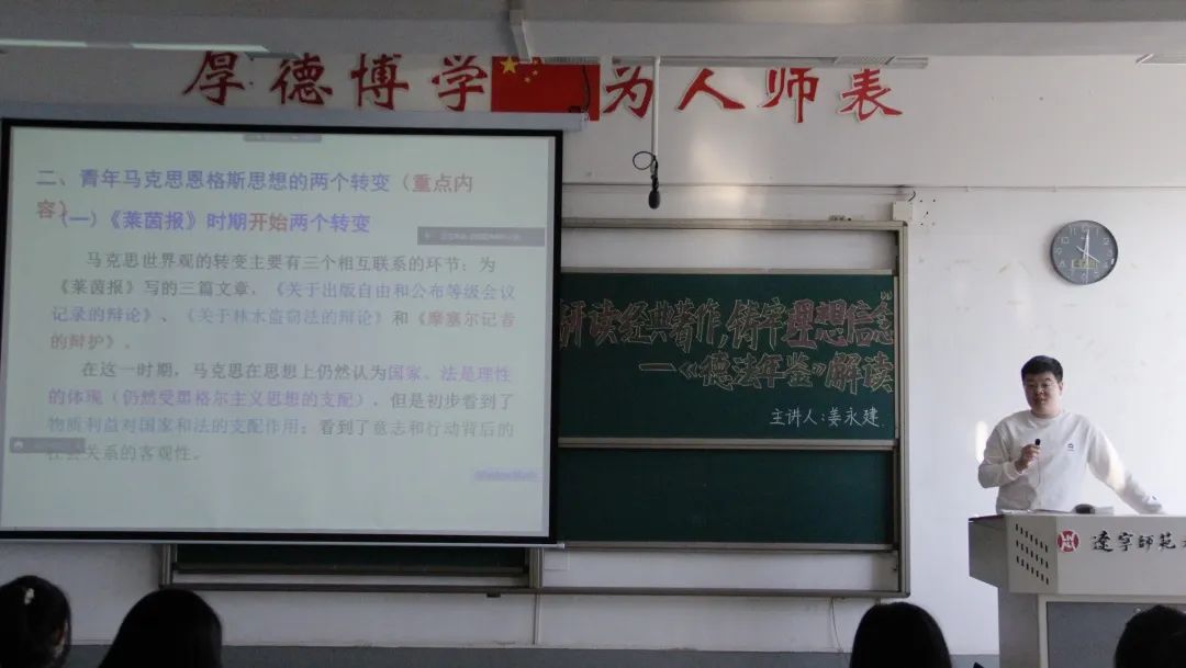 为深入学习马克思主义理论,坚定理想信念,推进学院理论文化建设,推动形成研读经典著作、巩固专业学识的良好学习氛围,2022年10月17日16:00,我院于文科2号楼401教室成功举办“研读经典著作,铸牢理想信念”(总25期)——“两个转变”的基本完成:《德法年鉴》解读主题讲座。本次主题讲座特邀马克思主义学院副教授姜永建老师主讲,马克思主义学院2020级、2021级本科生全员参加。