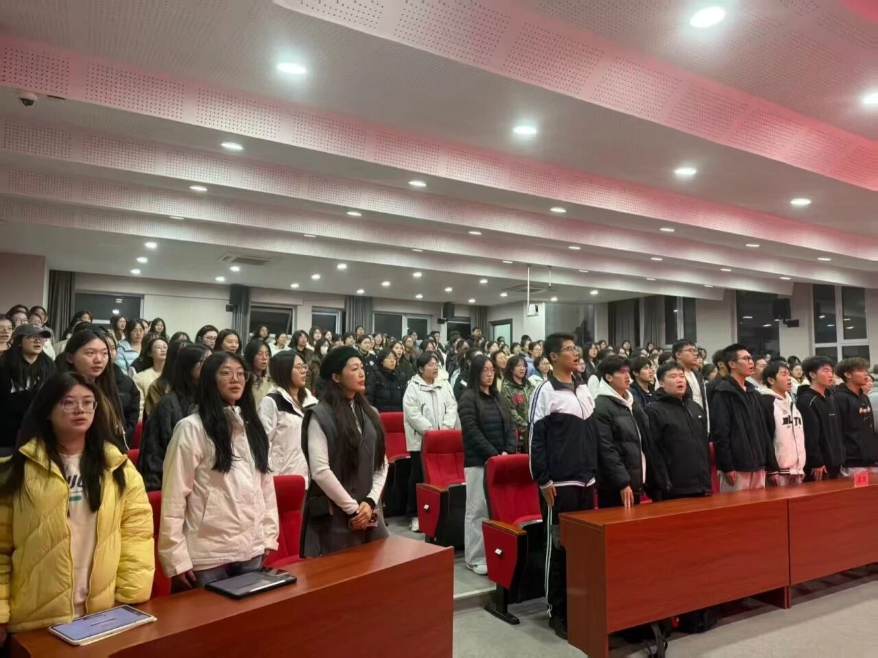 首先,裴老师以互动提问大家对抗美援朝的了解程度来开启讲座,在肯定师生的积极回应后,裴老师详细介绍了抗美援朝纪念馆的基本情况,让大家更清楚的认识到每一处都承载着不同的历史记忆与教育意义。随后,裴老师以“中国人民志愿军战歌”“抗美援朝纪念日”“冰雪长津湖”等8个经典故事为脉络,串联起抗美援朝战争的主线,让抽象的历史变得生动可感。讲座中,裴老师还分享了自己传播红色故事的经历:为向朱彦夫致敬,她曾跨越1000多公里前往山东淄博拜访,至今随身携带朱彦夫签名的书籍,以此提醒自己“讲好英雄故事,传承红色精神”。这种真挚的情感传递,让现场师生深受触动。最后,裴老师与现场师生共同诵读伟大抗美援朝精神的核心内涵,并齐唱《中国人民志愿军战歌》,激昂的歌声将现场氛围推向高潮。她勉励同学们铭记历史,将抗美援朝精神转化为奋进力量,为中华民族伟大复兴贡献青春力量。