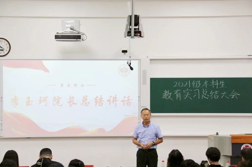 首先,各实习学校代表进行总结发言。他们分享了各自在校实习期间的表现和成长。随后,各组代表进行讲课汇报。同学们通过生动精彩的汇报展示,向各位领导、老师呈现出自己在实习期间取得的成果和进步,用积极进取的精神风貌展现了对教育事业的向往和热爱。紧接着,实习指导教师代表曲烽老师上台发言。曲老师对同学们的实习情况进行了全面总结,给予高度评价。大会还邀请了王晓翔副院长做实习工作总结。王院长对实习工作作出点评,肯定了实习带队教师和同学们的努力和成绩。最后,李玉珂院长进行总结讲话。他期望同学们在今后的学习和工作中要以“六要”的标准严格要求自己,向着“四有”好老师的目标不断奋进。