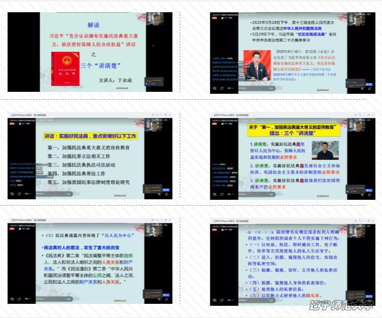 为庆祝中国共产党成立99周年,深入学习习近平新时代中国特色社会主义思想,实施青年马克思主义者培养工程,积极响应大连市社科联第十八届社科宣传普及周活动,在我校培养一批具有忠诚的政治品格,浓厚的家国情怀,扎实的理论功底,突出的能力素质,忠恕任事、人品服众的青年政治骨干,我校中国特色社会主义理论研究中心、团委、马克思主义学院联合举办,马克思主义学院团委、校青年马克思主义者理论研究会社团承办的庆祝中国共产党成立99周年理论宣讲周暨辽宁师范大学2020年“青年马克思主义者”培训班于7月13日10:00在线上举行“研读经典著作 铸牢理想信念” (第十九期)主题教育活动——习近平《充分认识颁布实施民法典重大意义 依法更好保障人民合法权益》解读。本次讲座由于永成老师主讲,我校团校中级班、青马研究会、市土地发展集团有限公司、马克思主义学院等共420多人参加学习。