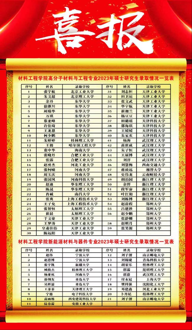 近期,2023年全国研究生考试复试结果陆续公布,材料工程学院2023届考研学子喜报频传,再获佳绩。高分子材料与工程专业硕士研究生录取率达47.6%,新能源材料与器件专业硕士研究生录取率达40.4%。其中,高分子材料与工程专业考研学生被“双一流”院校录取45人,占录取人数的76.27%。考研上线人数、被“双一流”院校录取等均创学院新高。