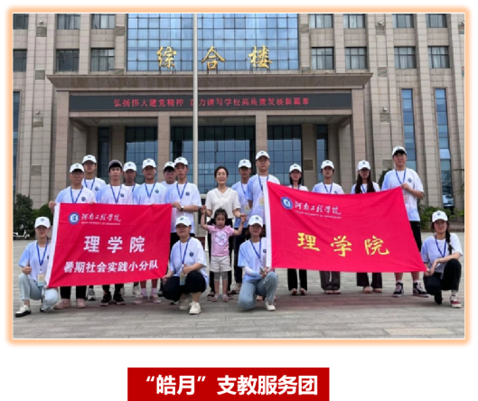 打造社会实践育人品牌。组织 “萤火”和 “皓月”两支服务团暑期赴周口市沈丘县蒋桥小学开展为期14天支教,打造以支教为主题的社会实践育人品牌。支教活动受到社会广泛关注,当地媒体以“传承七彩课堂”为题进行专题报道。