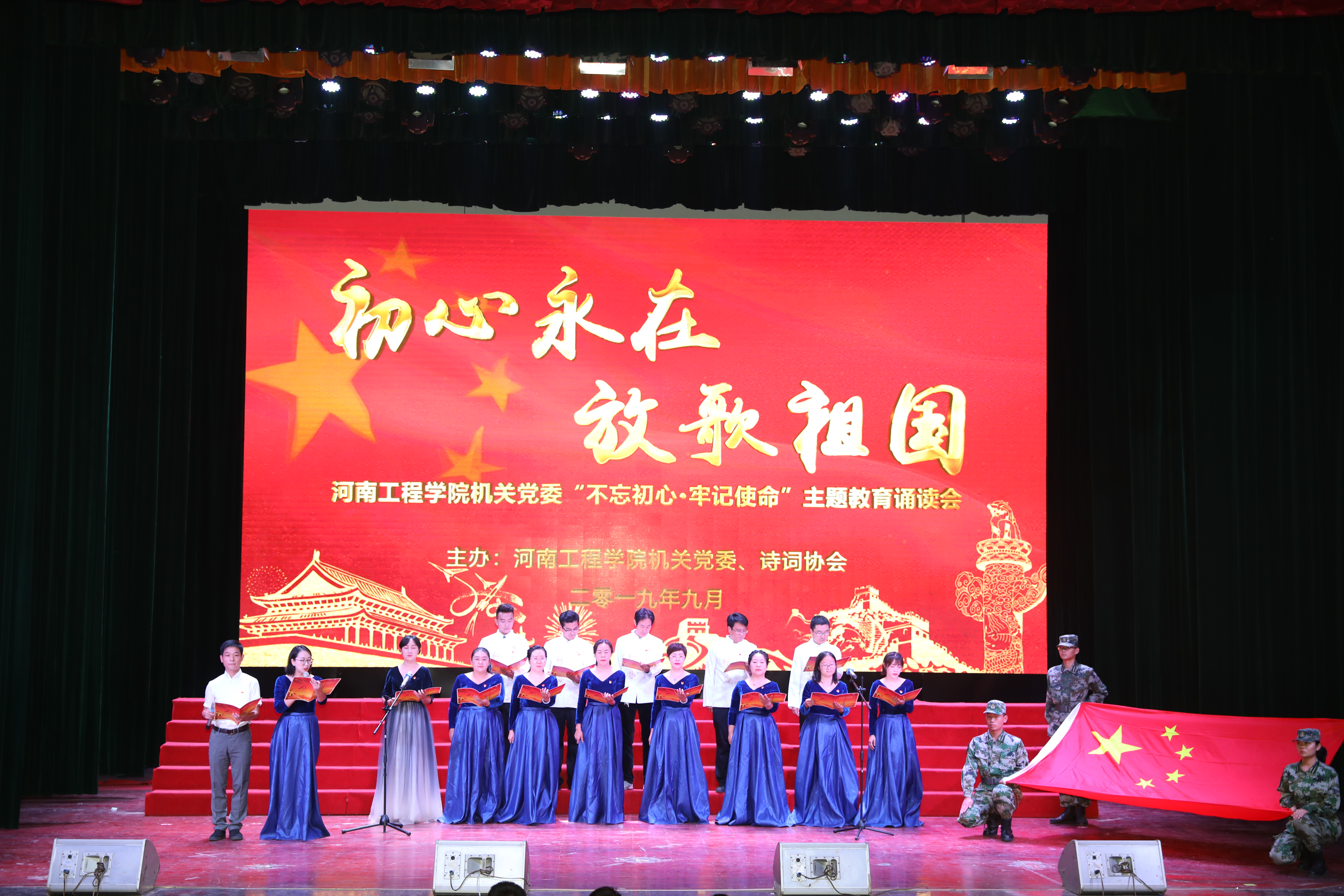 机关各支部精心准备,用朗诵的形式生动展现在中国共产党领导下国家取得的辉煌成就,生动展现中国人民追求幸福生活努力奋斗的精神风貌,人民群众对祖国的赤子之情。十三个党支部带来的咏诵节目分别是:保卫处党支部《伟大的中国梦》,纪检审党支部《祖国颂歌》,财务处党支部《读中国》,校办党支部《我的祖国》,教务党支部《西去列车的窗口》,学工党支部《伟大复兴,你我同在》,后勤基建党支部《新愚公移山》,科研党支部《在秋天,说出祖国的名字》,党群第一党支部《中国话》,教学保障党支部《我的祖国》,党群第二党支部《祖国,你就是我最想唱的那首歌》,招就外联党支部《祖国颂》,人事处党支部《祖国母语》,各支部表演形式多样,情绪饱满。校诗词协会带来原创诗《我和我的祖国》,本次党日活动取得了圆满成功。机关各支部从不同角度歌颂祖国、祝福祖国,充分表达了对美好生活的追求和对光明未来的憧憬。