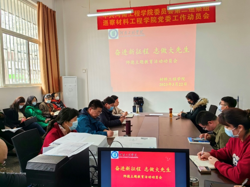 为深入学习贯彻党的二十大精神,贯彻落实习近平总书记关于教育的重要论述,持续加强和改进新时代师德师风建设,3月22日下午材料工程学院在桐柏路校区办公楼108召开“奋进新征程,志做大先生”师德主题教育活动动员会。本次会议由副院长杨柳主持,学院班子成员和全体教职工参加。