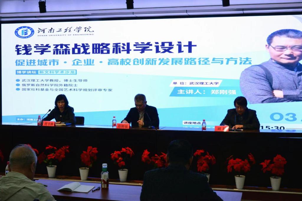 3月29日,我校邀请武汉理工大学艺术与设计学院博士生导师郑刚强教授开展主题为《钱学森战略科学设计 促进城市·企业·高校创新发展路径与方法》的学术交流活动。讲座由艺术设计学院书记刘超主持,科研处副处长周书焕致辞,校文科学院教师参加了此次讲座。