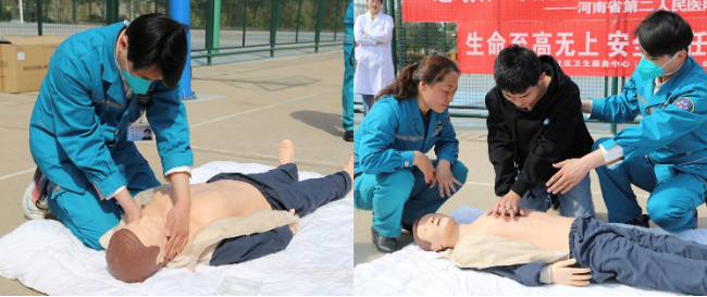 活动中,河南省第二人民医院医护人员就传染病防治和急救常识对参会人员进行培训。医务人员对心肺复苏、人工呼吸、海姆立克急救法等理论知识进行了细致讲解,并逐一进行实操演示。