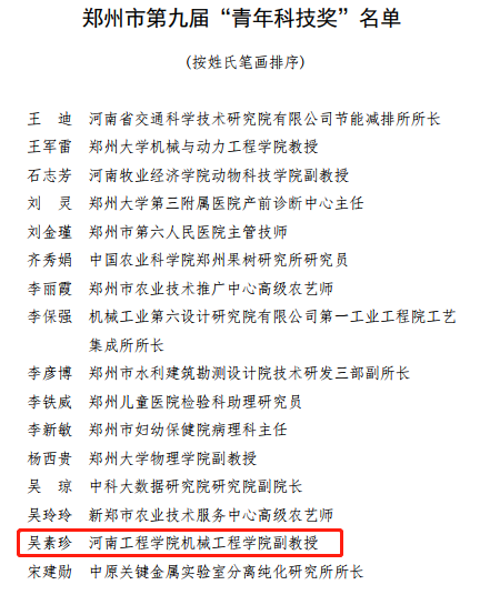 近日,机械工程学院教师吴素珍获得郑州市第九届“青年科技奖”荣誉称号,是该奖项获得者中唯一一位来自河南工程学院的教师。