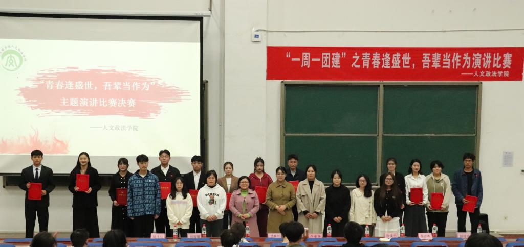 为展现青年风采,弘扬时代精神,11月22日下午,人文政法学院联合知行“一站式”学生社区于9A227国学大讲堂举办“青春逢盛世,吾辈当作为”主题演讲比赛。学院分团委书记卢中华、辅导员李二俊、吴胜男、社区驻楼辅导员张亚萍担任评委,200余名学生观看了比赛。