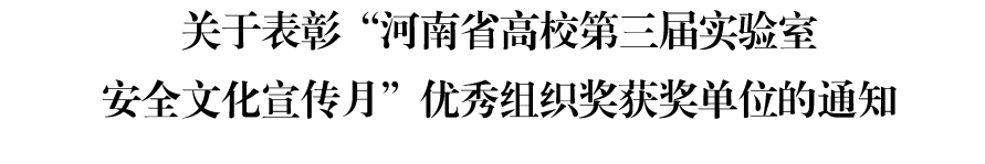 近日,河南省高校实验室工作研究会公布了“河南省第三届高校实验室安全文化宣传月优秀组织奖”获奖单位名单,我校荣获优秀组织奖,8名同学获得实验室安全知识大赛三等奖。