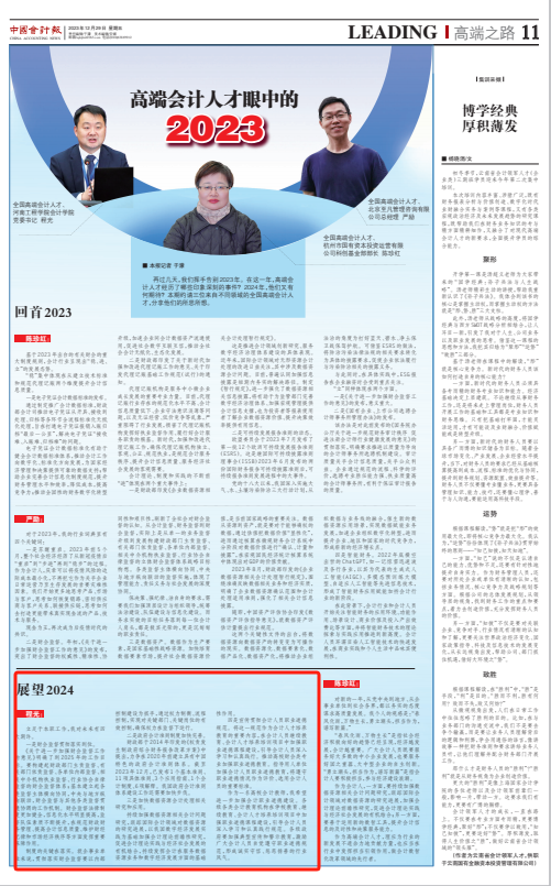 2023年12月29日的《中国会计报》第11版“高端之路”专栏刊登记者专访——“高端会计人才眼中的2024”,约请全国高端会计人才分享他们对会计行业发展的所思所想。我校全国高端会计人才、会计学院党委书记程光接受采访,就会计行业的未来发展发表见解。