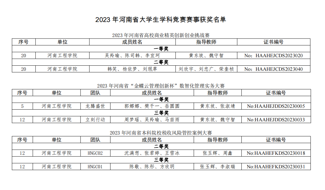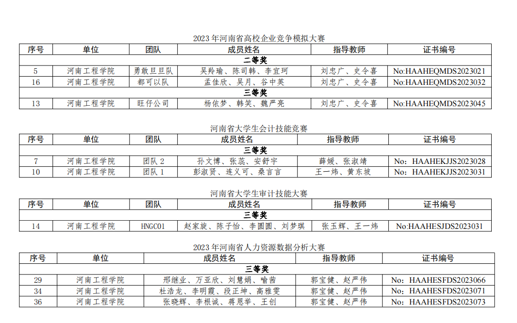 据悉,此次共公布由河南省高等教育学会举办的2023年河南省大学生会计大赛等10项赛事成绩。在“金蝶云管理创新杯数字化管理实务大赛”中,会计学院获得一等奖1项,三等奖1项,黄东坡和张淑靖获得优秀指导教师奖。在“本科院校税收风险管控案例大赛”中,会计学院获得二等奖1项,三等奖1项;在“会计技能竞赛”中,会计学院获得三等奖2项;在“大学生审计技能大赛”中,会计学院获得三等奖1项。“高校企业竞争模拟大赛”中,商学院获得二等奖2项,三等奖1项。刘忠广获得优秀指导教师奖。在“人力资源数据分析大赛”中,商学院获得三等奖3项。在“高校商业精英创新创业挑战赛”中,会计学院获得一等奖1项,商学院获得二等奖1项。