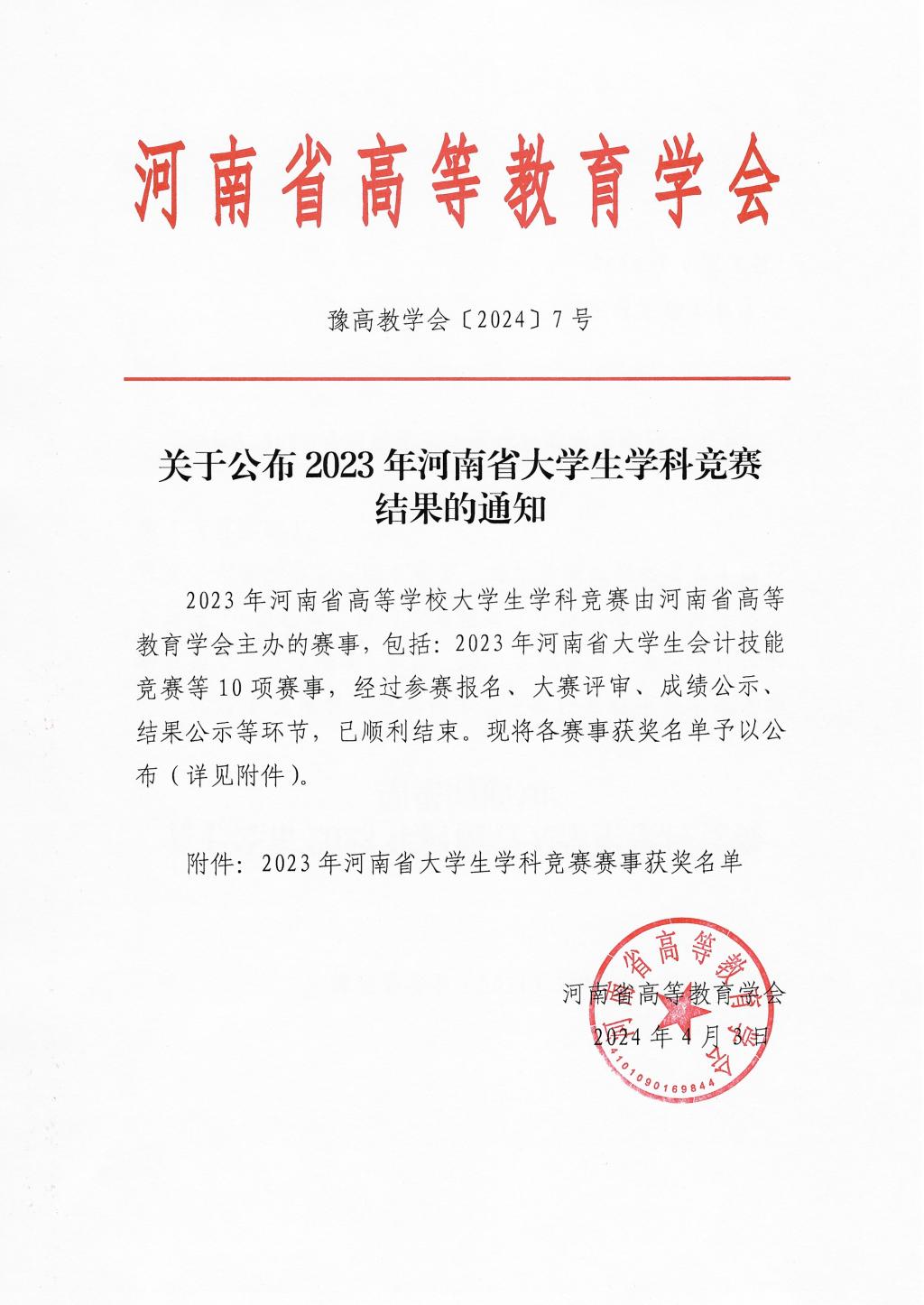 近日,河南省高等教育学会发布了《关于公布2023年河南省高等学校大学生学科竞赛赛事结果的通知》。我校共获得一等奖2项,二等奖4项,三等奖9项,优秀指导教师奖3项。