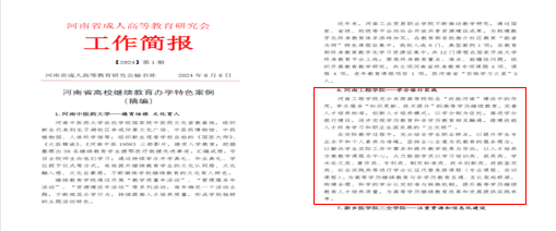 同时,河南省成人高等教育研究会公布了“关于表彰2023年度优秀论文的决定”。我校培训学院、继续教育学院提交的《高等学历继续教育学分银行建设探讨与研究——以河南工程学院为例》荣获一等奖。