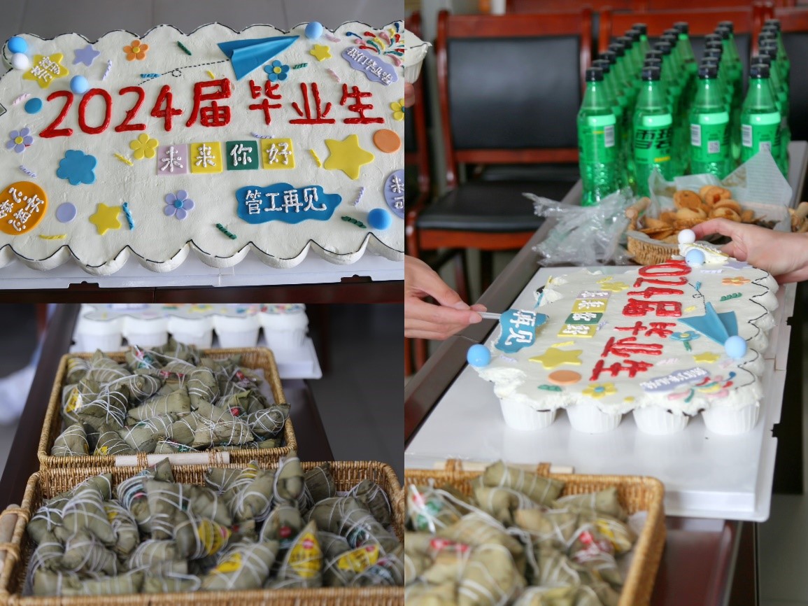 为了让毕业生们度过一个难忘的端午节,学院精心准备了毕业蛋糕、饮品和粽子等美食。同学们围坐在一起,品尝着美食,分享着欢笑,感受着学院大家庭的温暖和关怀。现场氛围热烈而温馨,洋溢着青春与活力的气息。