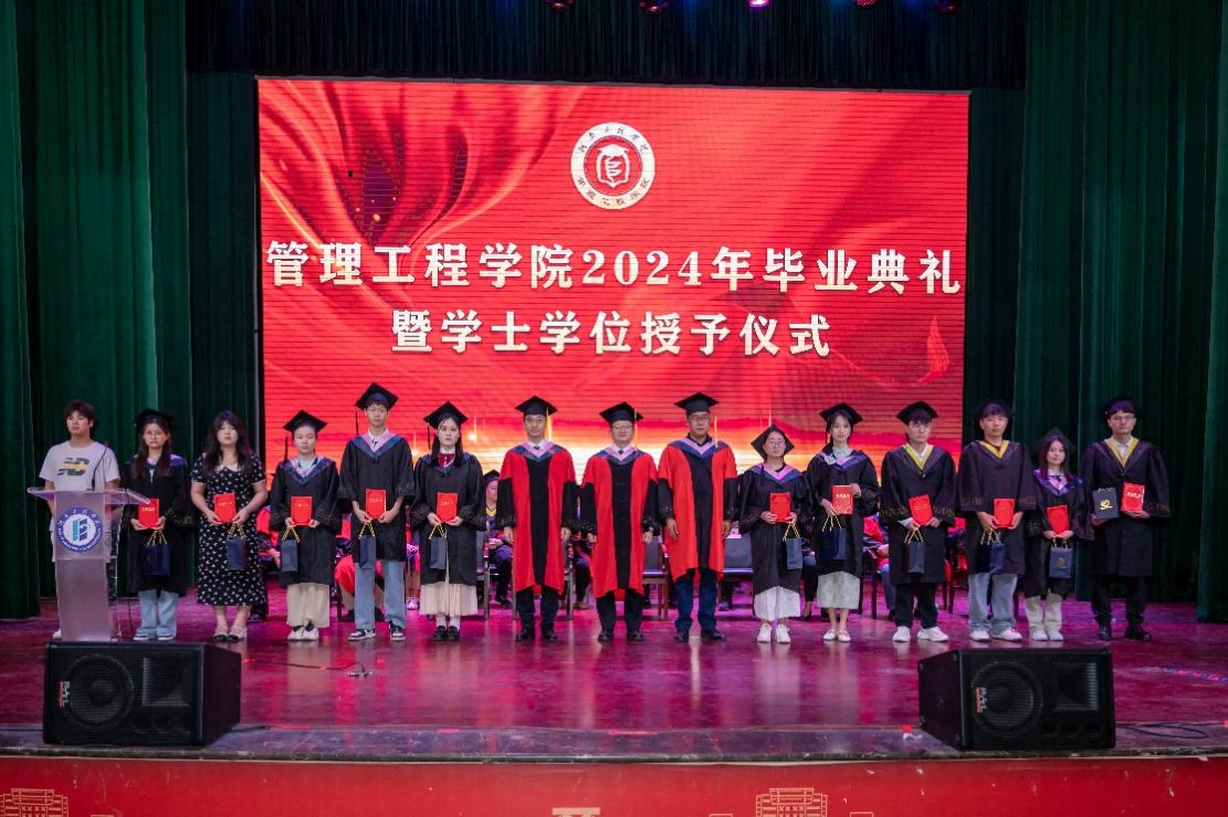 毕业生代表、在校生代表和教师代表分别发言。全体领导为管理工程学院2024届优秀毕业生、考研学生代表、星火先锋和就业先进个人代表颁发奖励证书,并合影留念。
