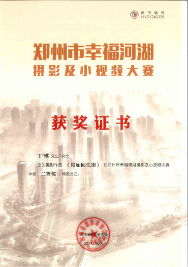 近日,由河南省摄影家协会与郑州市河长制办公室联合主办的“郑州市幸福河湖摄影及小视频大赛”圆满落幕。我校后勤管理服务中心王琪老师的摄影作品《宛如回江南》脱颖而出,荣获本次大赛的二等奖。