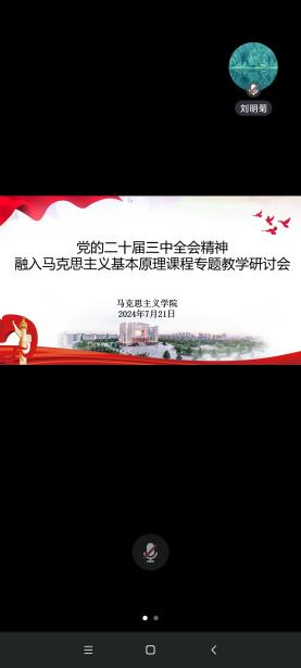 为深入学习贯彻党的二十届三中全会精神,及时将会议精神融入思政课教学,7月21日,马克思主义学院各教研室开展党的二十届三中全会精神融入思政课专题教学研讨会,各个教研室专兼职教师参与研讨。此次研讨会旨在准确领会和把握党的二十届三中全会精神的思想精髓、核心要义,围绕“融入什么、如何融入、融到什么程度”等问题,将党的二十届三中全会精神精准融入思政课教学,有力引导学生坚定理想信念,增强投身民族复兴的强烈使命感。