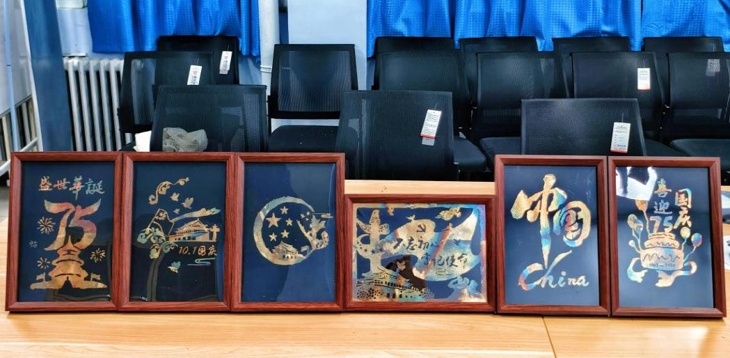 随后,同学们纷纷拿起工具,在邓歌老师和张婧雯老师的指导下投入到烧箔画的创作中。大家首先绘制出自己心目中的国庆主题图案,然后小心翼翼地铺展箔片,用刷子轻扫并观察其变化莫测的色彩与质感,待胶水风干后再进行清理,经过涂胶、贴箔、清理等工序,一幅幅精美的烧箔画作品就完成了!