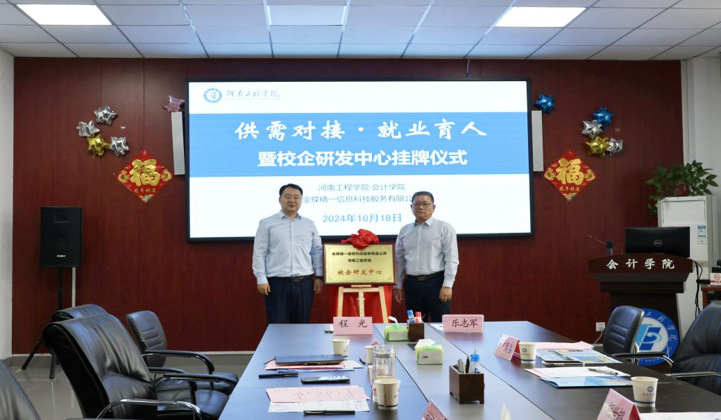 为进一步深化产教融合,推进学院创新、实践及就业工作,10月18日上午,会计学院在8号楼8342举行了供需对接·就业育人座谈会及校企研发中心挂牌仪式,会计学院党委书记、院长程光,党委副书记张维、金蝶精一信息科技服务有限公司执行副总裁乐志军,华北区经理何嵩占、客户经理胡世超等校企双方领导和老师参加签约仪式,仪式由副院长刘根霞主持。
