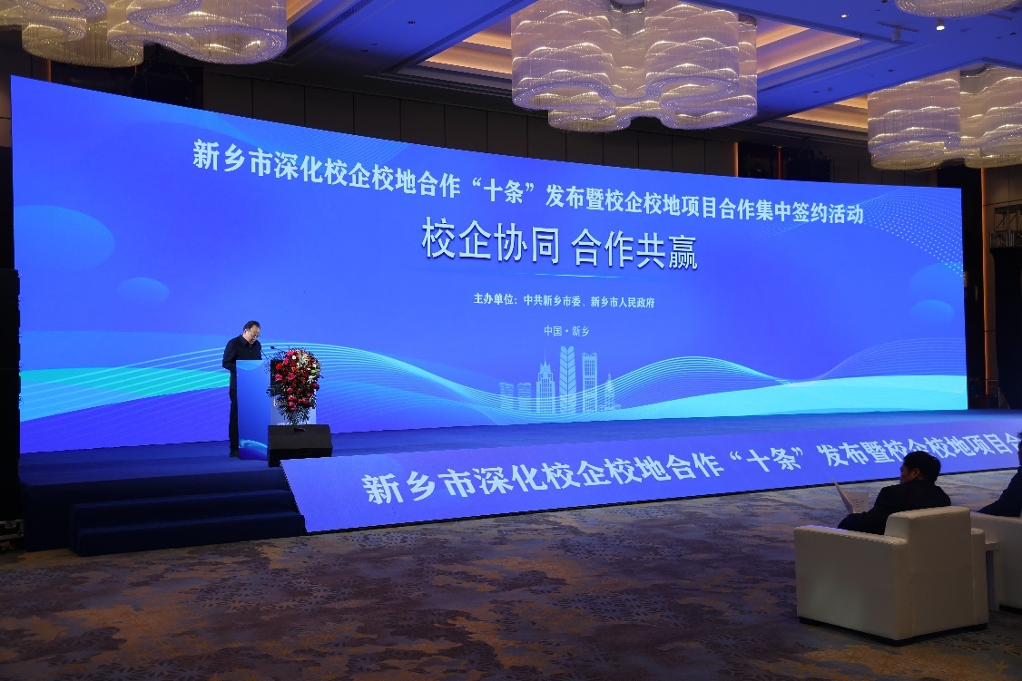 1月10日上午,新乡市深化校企校地合作“十条”发布暨校企校地项目合作集中签约活动在新乡国际会议中心隆重举行。新乡市委书记李卫东、市长魏建平、省委组织部副部长兼省委人才办主任杨建国等领导出席会议并发表重要讲话,材料工程学院党委书记辛长征受邀参加会议。