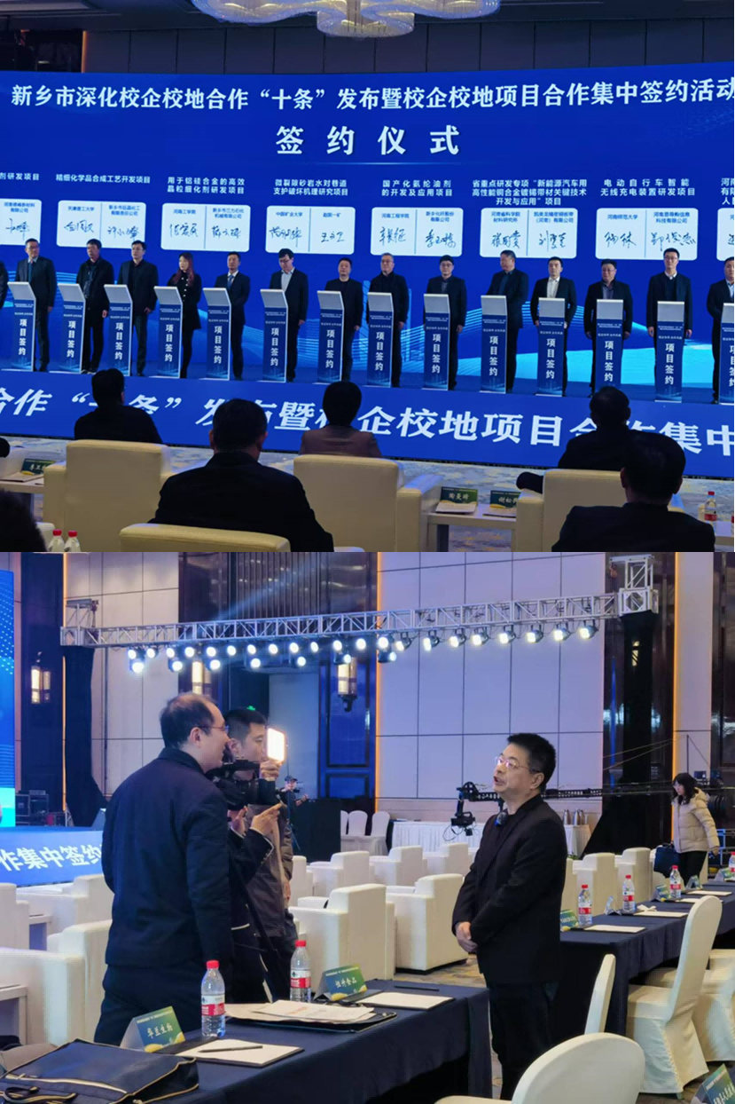会后,辛长征接受新乡广播电视台采访,介绍了我校的办学历史以及和新乡化纤股份有限公司长期的合作成果,并表示学院已搭建起产学研合作平台和人才培养基地,为企业输送了大量优质人才。辛长征强调,今后将继续优化人才培养机制,加强与我省头部企业合作,在相关“卡脖子”技术领域中发挥学校的学科专业优势,为开发具有自主知识产权和核心竞争力的氨纶国产化高端油剂贡献河工力量。