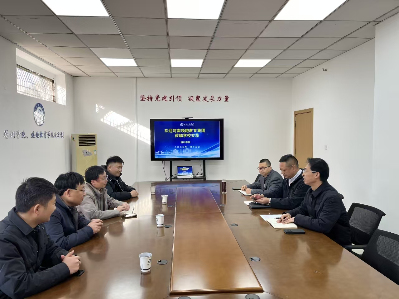 1月15日上午,河南领跑教育集团董事长郭鹏一行来校考察交流。我校培训学院院长周枫钧、副院长陈俊豪热情接待考察组一行,双方在培训学院会议室举行了座谈会。