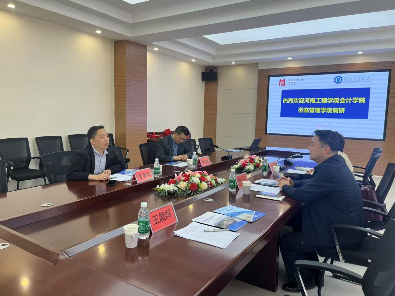 为深化交流合作,共谋学科发展,4月15日上午,会计学院党委书记、院长程光、副院长刘根霞一行率队赴河南工业大学管理学院开展学科建设专题调研活动。管理学院党委书记李国仓、副院长穆庆榜参加交流活动。