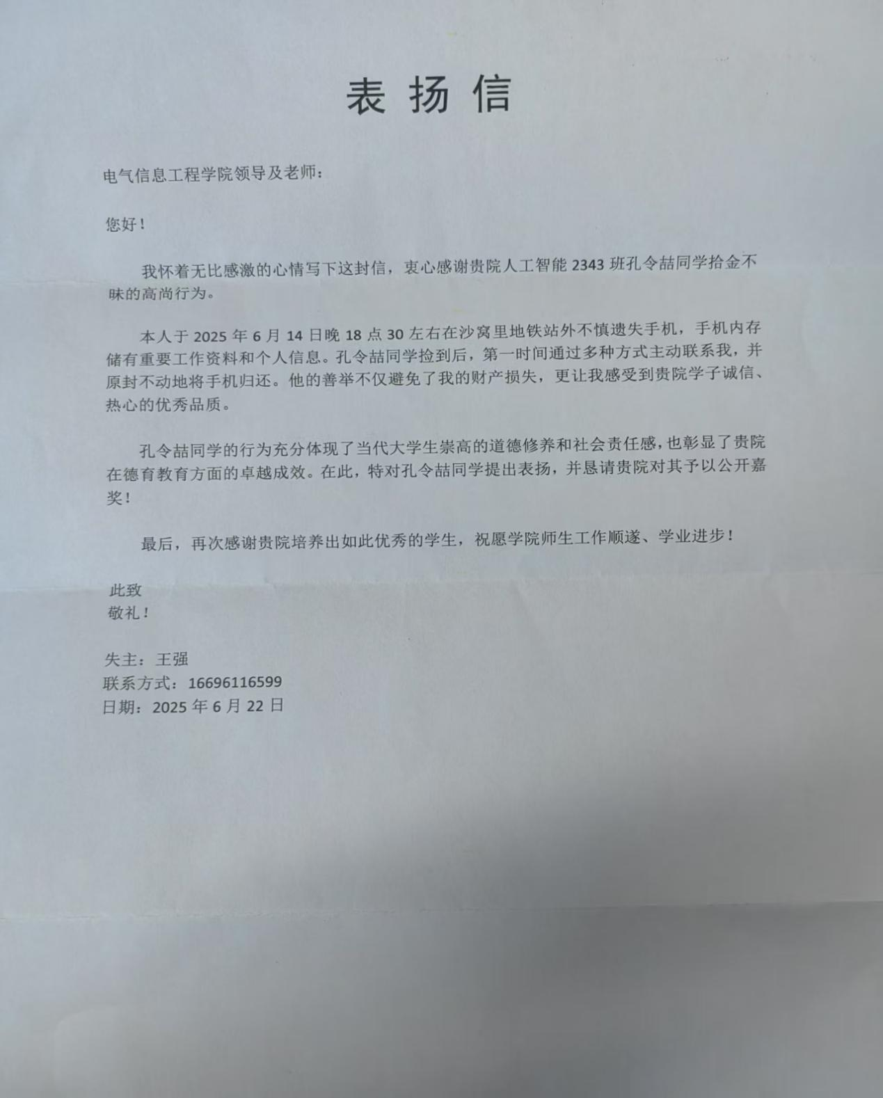 6月14日晚,孔令喆同学在沙窝里地铁站外捡到失主手机后,第一时间多方联系失主,将手机原封不动归还,避免了财产损失与信息泄漏风险。这一拾金不昧的举动,不仅彰显了个人诚信热心的美好品质,更体现了当代大学生崇高道德修养与社会责任感,是学院德育教育成效的生动缩影。