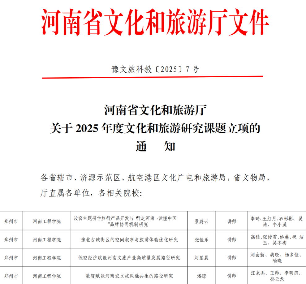 近日,河南省2025年度文化和旅游研究课题立项名单正式公布,我校艺术设计学院景蔚云、外语学院张佳乐、商学院刘星晨、马克思主义学院潘琼主持的项目成功立项。